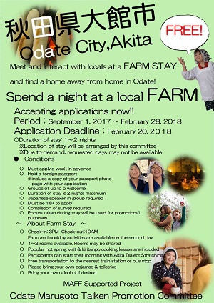 Some of you may have heard about Akita farm stay or most of you didn’t ever heard about it before, which is obvious. This farm stay campaign is a corporation between the government and local people in Akita area, located in Odate province, in the north of Japan.