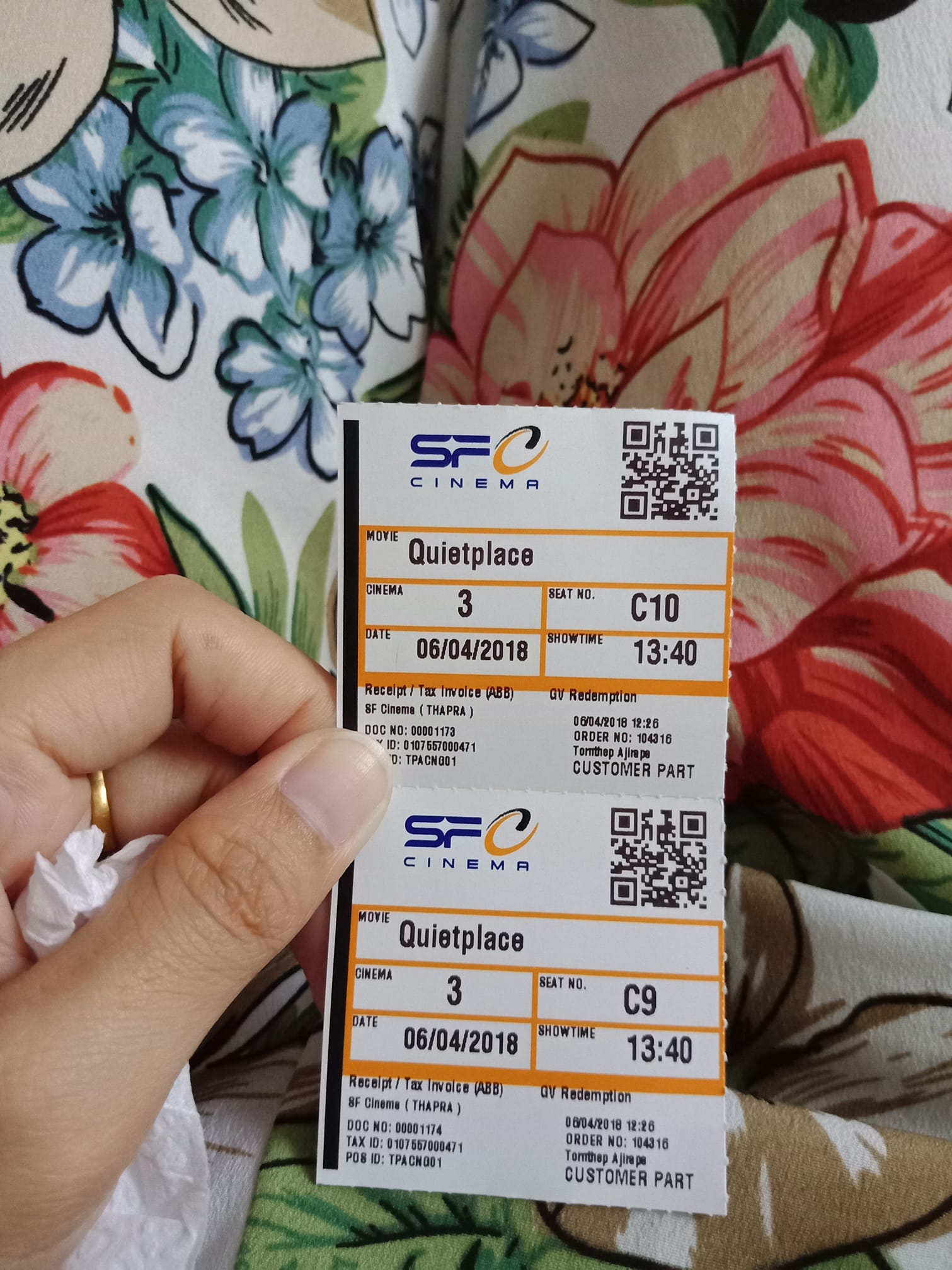 พอดีวันนี้ว่าง เลยได้โอกาสชวนคุณแฟนไปดูหนัง ไอ้เราก็อยากดู A Quiet Place ช่วงเช้าทำธุระไรเสร็จก็ดิ่งไปเดอะมอลล์ท่าพระใกล้ๆบ้าน ตั๋วใบละ 240 บาทราคา480 พอดีใช้สิทธิ์ส่วนลดดีแทคกับวันทูลคอลกะแฟนคนละสิทธิ์ได้ส่วนลดมาตั้ง 250บาท เหลือต้องจ่ายแค่ 230 บาท ดีจริงๆ