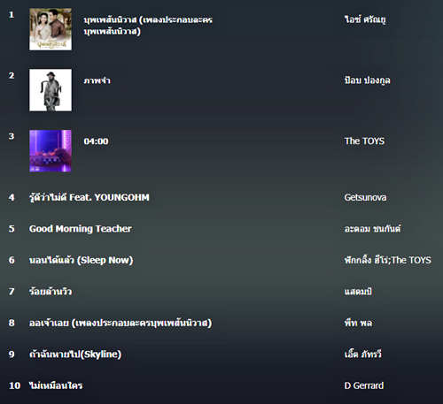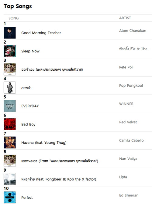 รายงานชาร์ตประจำวันที่ 6 เมษายน 2561 ] **Apple Music** **iTunes Store** **Joox** **Spotify** ================================== สรุปอันดับ1 *Good Morning Teache