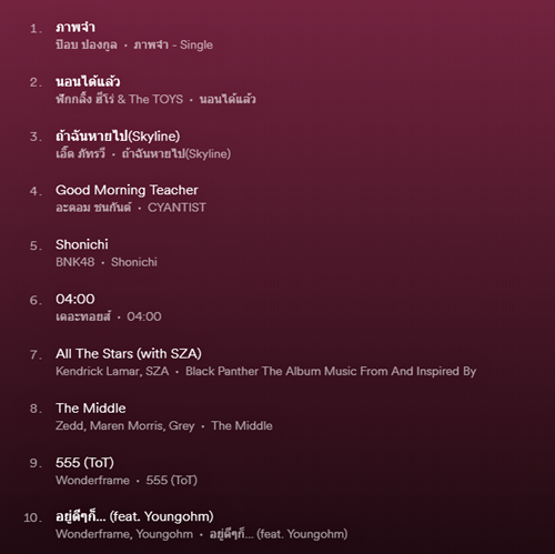 รายงานชาร์ตประจำวันที่ 8 เมษายน 2561 ] **Apple Music** **iTunes Store** **Joox** **Spotify** ================================== สรุปอันดับ1 *Good Morning Teache