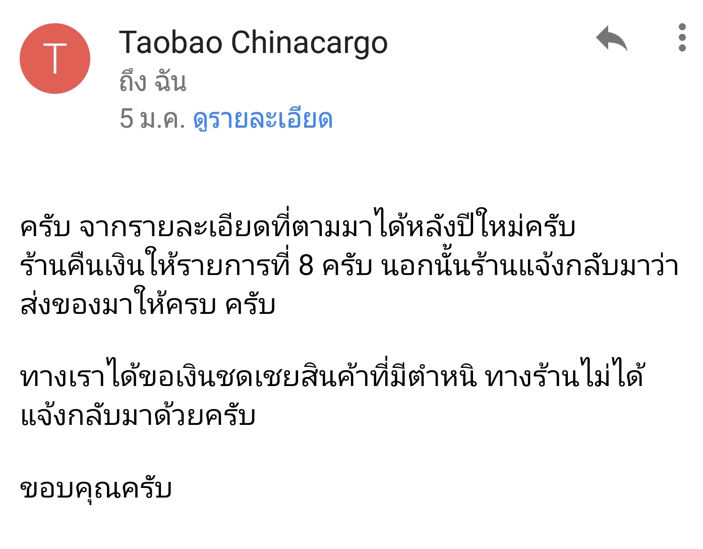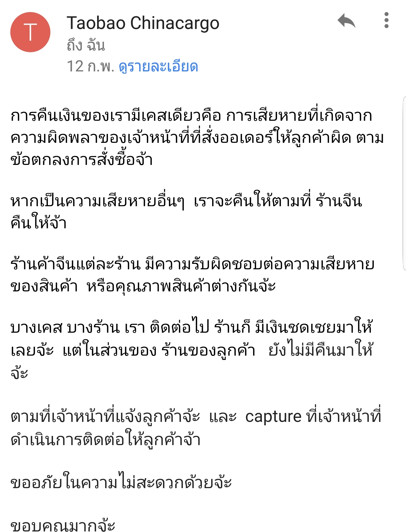 แต่ก็ยังไม่ได้ชดเชยใด กระทั่งมีสอบถามไปอีก ก็ได้ตอบมา (ตามภาพ)