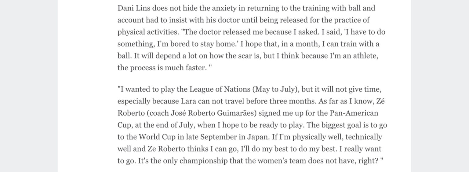 ใครที่คิดถึงลินส์ มีข่าวมาฝาก ตอนนี้ลินส์เริ่มกลับมาฟื้นฟูร่างกายแล้วหลังจากคลอดได้ 40 วัน เป้าหมายคือรายการชิงแชมป์โลก ซึ่งลินส์ต้องการกลับมาเล่นให้ทีมชาติ โดยลินส์อยากไปตั้งแต่รายการ VNL แต่ด้วยความที่ลูกยังเล็ก และต้องใช้เวลาฟื้นฟูร่างกายจึงคาดว่ารายการแรกที่ลินส์จะกลับมาลงคือ Pan American Cup ปลายเดือนกรกฎาคมเพื่อเตรียมทีมก่อนไปชิงแชมป์โลก (ปีนี้บราซิลมี 4 รายการ VNL, Pan American Cup, Montreux, ชิงแชมป์โลก ตามลำดับ)