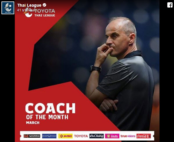 เว็บไซต์และแฟนเพจอย่างเป็นทางการของไทยลีก ฝ่ายจัดการแข่งขันโตโยต้า ไทยลีก 2018 ประกาศรางวัลผู้เล่นและโค้ชยอดเยี่ยมประจำเดือน มีนาคม 2018 โดยโค้ชยอดเยี่ยมตกเป็นของ โบซิดาร์ บันโดวิช จากบุรีรัมย์ ยูไนเต็ด เช่นเดียวกับนักเตะยอดเยี่ยมเป็น ดิโอโก้ หลุยส์ ซานโต กองหน้าจากค่ายปราสาทสายฟ้า เหมือนกัน