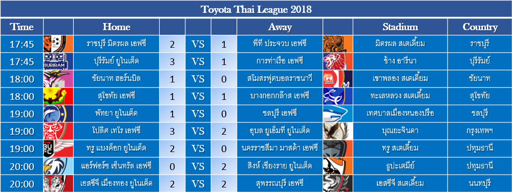 สรุปผลฟุตบอล ไทยลีก 2018 ประจำวันเสาร์ที่ 31 มีนาคม 2561 พร้อมตารางคะแนน