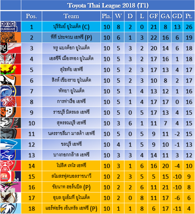 สรุปผลฟุตบอล ไทยลีก 2018 ประจำวันเสาร์ที่ 22 กันยายน 2561 พร้อมตารางคะแนน