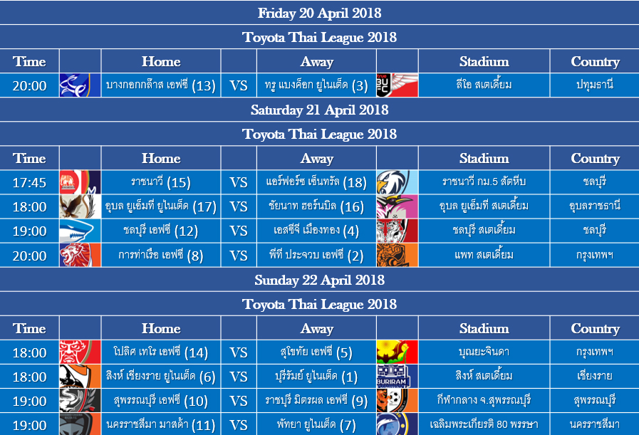 สรุปผลฟุตบอล ไทยลีก 2018 ประจำวันอาทิตย์ที่ 29 เมษายน 2561 พร้อมตารางคะแนน