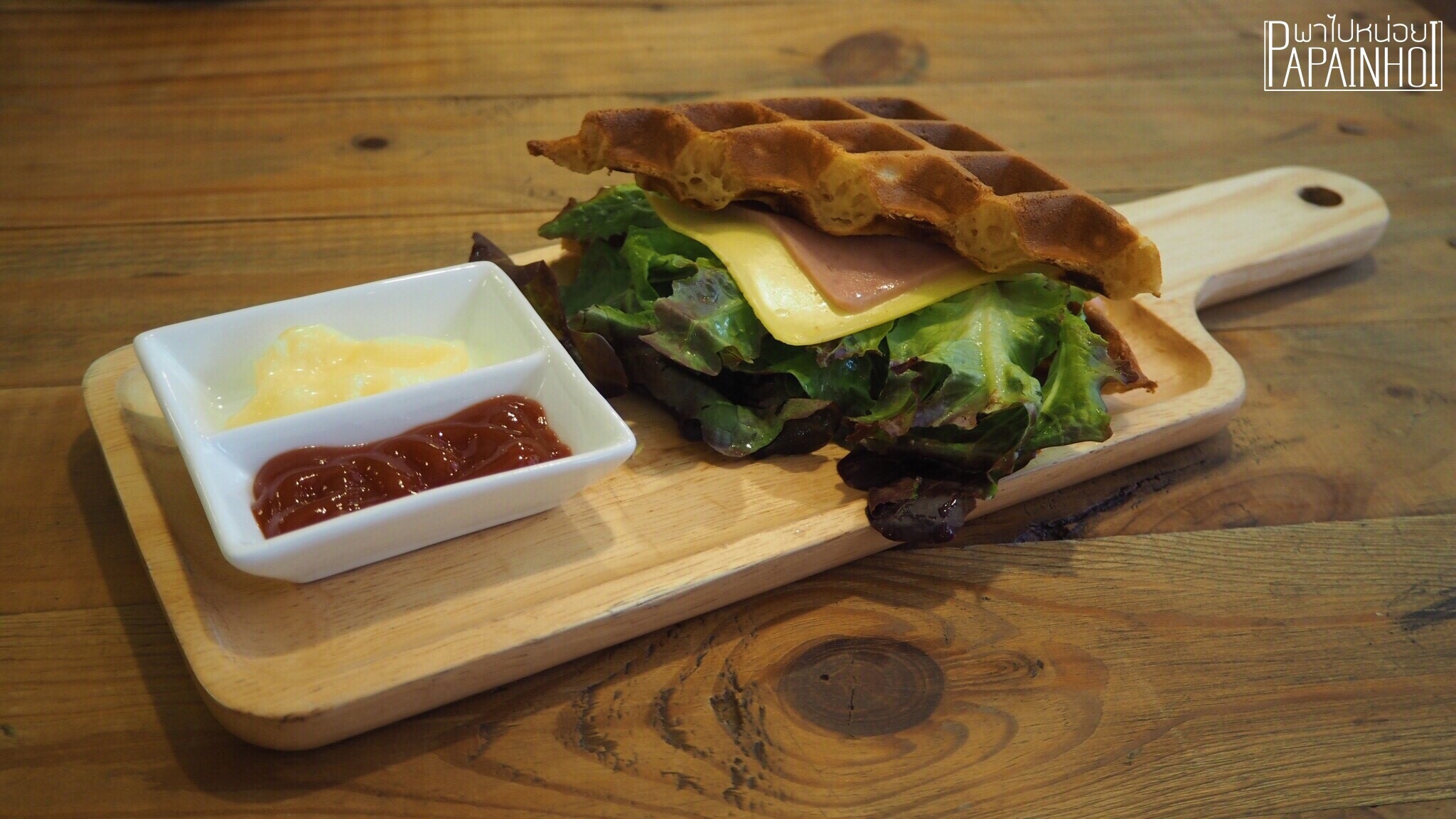 เริ่มที่ของคาวกันก่อนดีกว่า เมนูแรกที่กินก็ประทับใจเรื่องรสชาติ และไอเดียที่เอาวาฟเฟิลมาทำเป็นแซนวิช เมนูนี้เรียกได้ว่าคุ้มสุด ๆ ทานชิ้นเดียวก็อิ่มแล้วววว ใครที่ไม่ชอบของหวาน ก็เลือกเมนูของคาวทานได้เลย (แอบกระซิบว่ามีไข่กระทะด้วยน้าา)