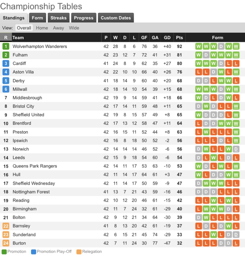 วูฟฟ์ น่าจะลอยตัวแล้ว เข้าที่ 1 แต่ก็ไม่แน่ เพราะเท่าที่ได้ตามดูแชมป์เปี้ยนชิปปีนี้ ผีเข้าผีออกกันบ่อย
