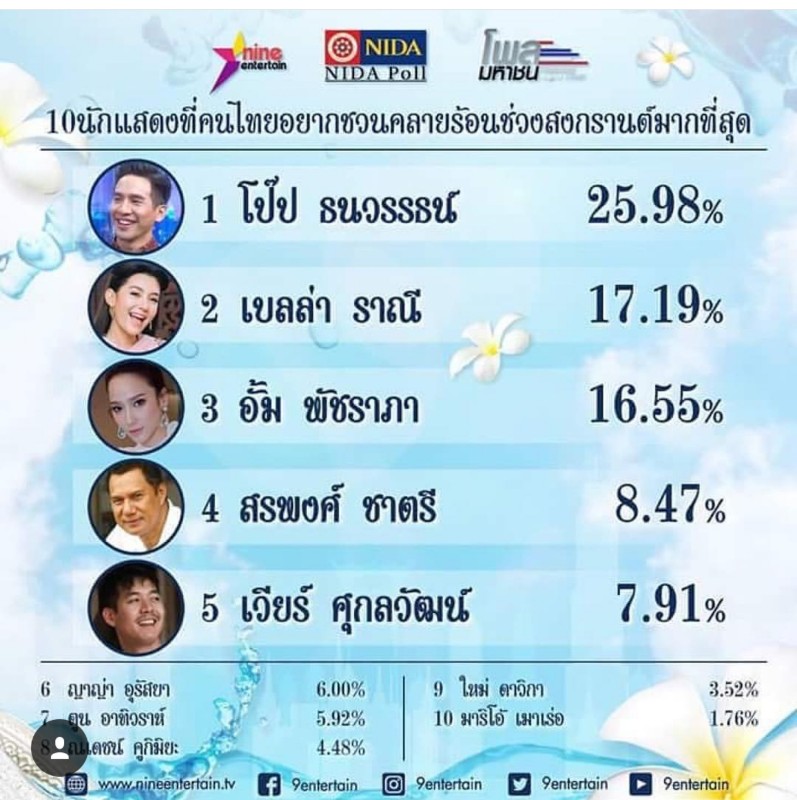 (โพลแรกมาแล้วจ้า) บิ๊กตู่-โป๊ป-เบลล่า”ติดโผประชาชนอยากรดน้ำสงกรานต์มากสุด....