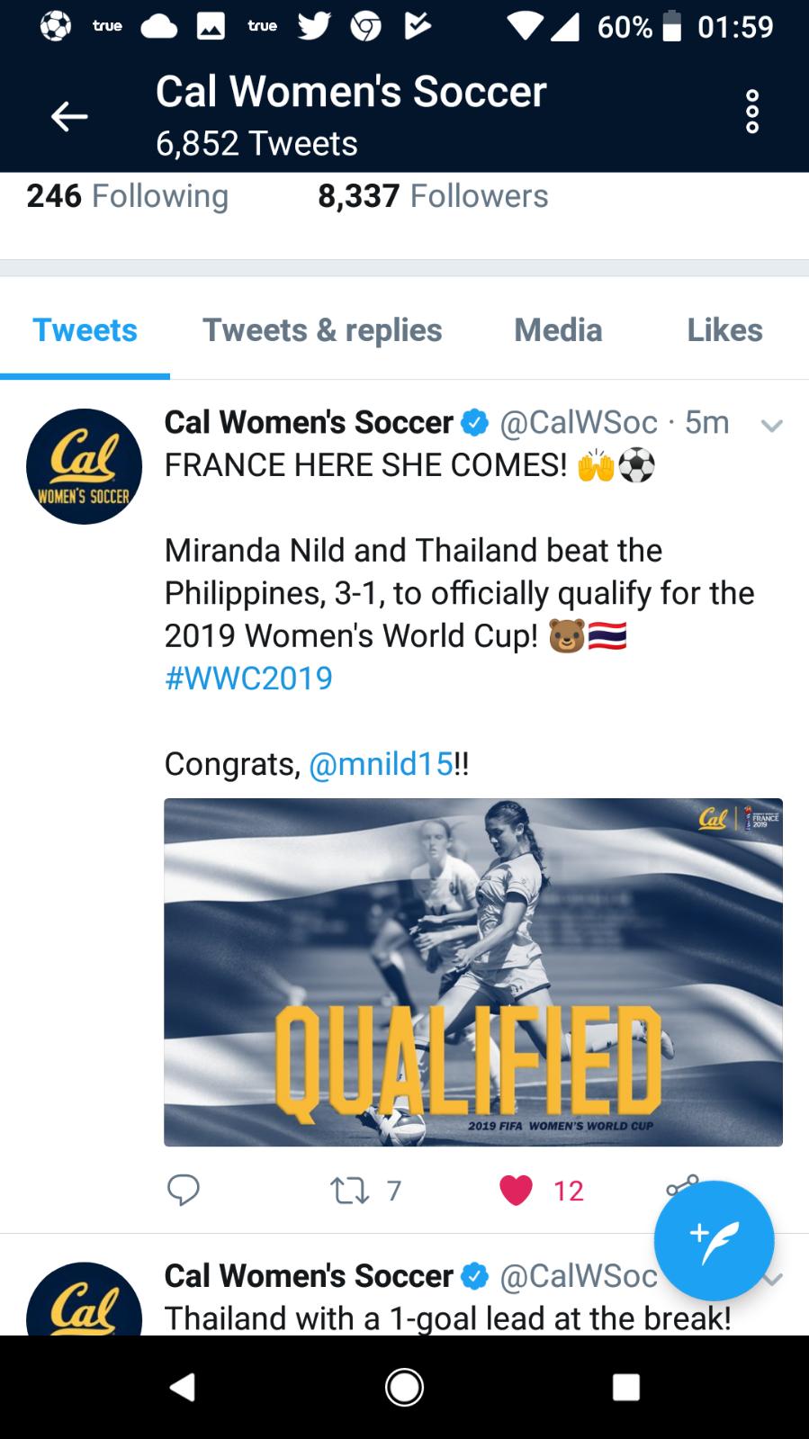 ต้นสังกัด Miranda Nild, สุเชาวดี,น้องน้อง มหาวิทยาลัย UC Berkeley ทวีตแสดงความยินดีทีมไทยได้ไปบอลโลกหลังจบเกมไทยชนะฟิลิปปินส์ ซึ่งจบเกมส์น้องมิรันด้าจะบินกลับ US เพื่อไปเรียนต่อ U ที่น้องเรียนนี้ดังมากมาย กีฬาดี วิชาการแน่น ขอบคุณต้นสังกัด Calbear ที่ฝึกฝนน้องและให้น้องมาเก็บตัวด้วยครับ ปีก่อนน้องยิงพาไทยมารอบสุดท้าย AFC รอบสุดท้ายโชว์ฟอร์มสุดยอดกว่าปีก่อนช่วยพาทีมไปบอลโลก ยอดเยี่ยมมม