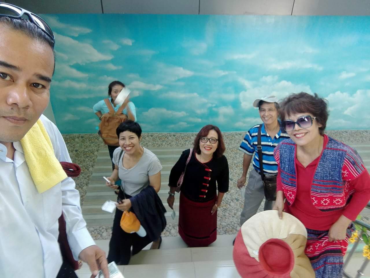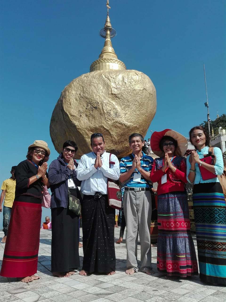 เอาละค่ะ มาเล่าการเดินทางกันเลย หลังจากเราทานเช้า Check out เรียบร้อย Minh Thiri ได้ขับรถพาเราไปสถานีรถโดยสาร เราต้องจอดรถเราไว้ที่นี่และต่อรถบรรทุกเพื่อขึ้นเขา ในการโดยสารรถครั้งนี้ Minh ได้ไปติดต่อให้พวกเรานั่งด้านในแคป เพื่อความสะดวกสบาย แต่จริงแล้ว แม่ พ่อ และครูทัศ รวมทั้งมิน ต้องนั่งหดขา เมื่อยพอสมควร แต่เอาเถอะดีกว่านั่งข้างหลังกระบะ นั่งด้านในต้องจ่ายแพงกว่านั่งด้านนอก ก่อนจะขึ้นมินได้บอกกับเราว่า เราจะขึ้น กระเช้ากันด้วยวันนี้ หมายความว่าเราจะนั่งรถไประยะหนึ่ง แล้วเราจะไปเปลี่ยนไปนั่ง Cable car ต่อไป เพื่อเก็บบรรยากาศ ก่อนหน้านี้ถ้าจะขึ้นอืนแขวนต้องนั่งรถอย่างเดียว คราวนี้โชคดีได้นั่ง กระเช้า ช่วงเดือนตุลาคม 2017 ดวงพรมาขึ้นก็ยังต้องนั่งรถอย่างเดียว กระเช้ากำลังสร้าง ดังนั้นเราจึงต้องเสียทั้งค่ารถโดยสาร และค่านั่งกระเช้า ซึ่งค่านั่งกระเช้า คนละ 7,000 จ๊าตลักษณะ One way อย่าแปลกใจนะคะ One way แล้วไม่ลงเหรอ ลงค่ะแต่ขาลง เราลงโดยรถโดยสาร เพื่อประหยัด เอาแค่บรรยากาศ เมื่อขึ้นรถ ไปต่อนั่งกระเช้าเสร็จ เราก็ต้องเดินเท้ากันเป็นระยะทางประมาณกิโล ออแต่ก่อนจะเข้าไปถึงองค์พระธาตุ เราก็จะต้องเสียค่าธรรมเนียมเข้า คนละ 10,000 จ๊าต เนื่องจากเป็นคนต่างชาติ นี่ขนาดดวงพรพยายามแต่งตัวให้เหมือนพม่าแล้วนะ 555 หลังจากจ่ายค่าธรรมเนียมเรียบร้อย ทุกคนก็เต็มทีกับการถ่ายภาพตามอัธยาศัย โดยคุณ Minh จะแนะนำว่าตรงไหนถ่ายออกมาดี ออกมาสวย จากตรงนี้ ในขณะที่ทุกท่านกำลังซึมซับความอัศจรรย์ของก้อนหินสีทองที่ตั้งตระหง่านอยู่โดยไม่ล้มลงมา ดวงพรก็ขอสวดมนต์ ทำสมาธิ อุทิศส่วนบุญให้กับทุกท่าน จนได้เวลาพอสมควร ณ จุดนี้ Minh ได้พาคุณพ่อชาญชัยเข้าไปกราบองค์พระธาตุอย่างใกล้ชิดเพราะเขาอนุญาตให้เฉพาะผู้ชายเข้าไปได้ เราเดินถ่ายรูป มีน้องๆชาวพม่ามาขายของที่ระลึก พูดคุยหยอกล้อกันสนุกสนาน แม่นัดดาเข้าใจลูกสาวว่าลูกจะต้องสวดมนต์ แม่บอกลูกสาวไปสวดมนต์ลูกเดี๋ยวแม่ถ่ายรูปให้ บอกได้เลยจากปี พ.ศ 2545 จนถึงทุกวันนี้ 16 ปีแล้วที่มาเป็นลูกแม่สาว สุขใจเสมอ แม่เป็นแบบอย่างในการทำงาน การอยู่ร่วมกันในสังคม ท้ายรีวิวนี้จะบอกว่า รักทุกคน