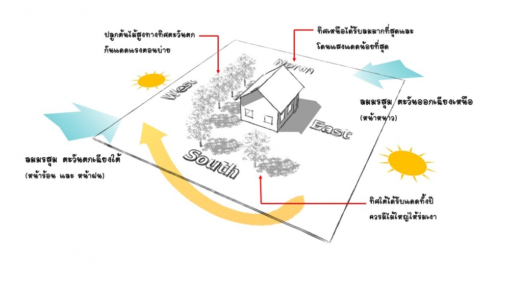 แดดที่ร้อน จะอยู่ในช่วง เที่ยง ถึง 5โมงเย็น ซึ่งจะจะอยู่ในช่วงทิศใต้ไปจะถึงตะวันตกพอดี นี่เป็นทิศทางที่เราควรคำนึงว่าจะวางพื้นที่ใช้สอยอะไร ไว้ในทิศนี้