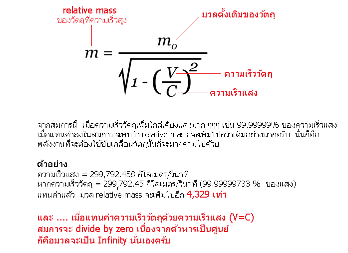 เมื่อวัตถุใด ๆ มีความเร็วใกล้แสงมาก ๆ relative mass ของวัตถุนั้นก็จะเพิ่มขึ้นไปเรื่อย ๆ
