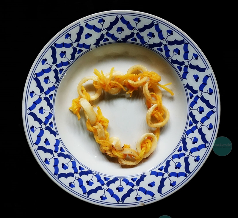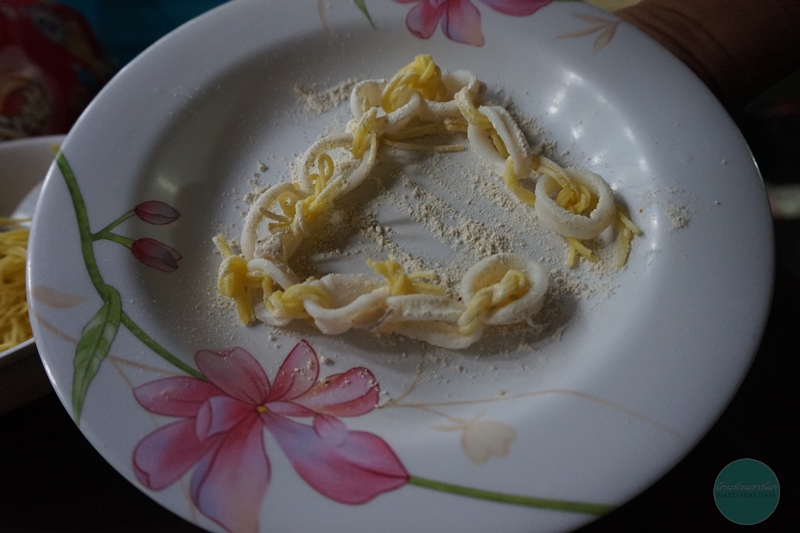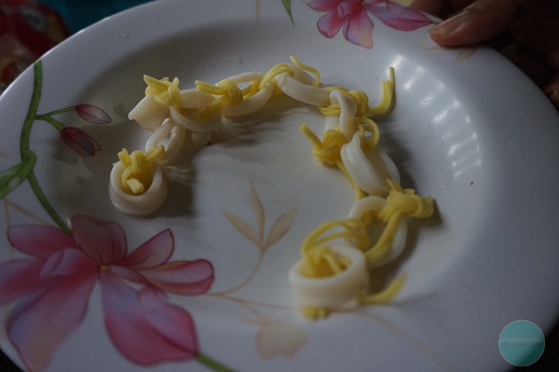 ปลาหมึกหั่นแว่นลวกน้ำเดือดจัด นำหมี่มาผูกเหมือนผูกเชือกเข้าด้วยกัน