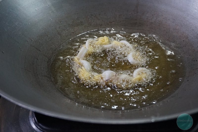 คลุกแป้งทอดกรอบบางๆ ไม่ต้องปรุงรสใดๆเพราะหมี่ซั่วเวลาทอดเสร็จจะมีรสเค็มอ่อนอยู่แล้ว
