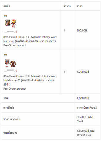 หนัง Avengers Infinity Wars กำลังจะเข้า เลยเริ่มจากพรีออเดอร์ Funko Pop จากเว็บเมเจอร์ค่ะ เห็นในหน้าเว็บตอนนั้น มี ไอรอนแมน ราคา 600 บาท และฮัคบัสเตอร์ 6 นิ้ว ในราคา 950 บาท เลยกดลงตะกร้าทันที