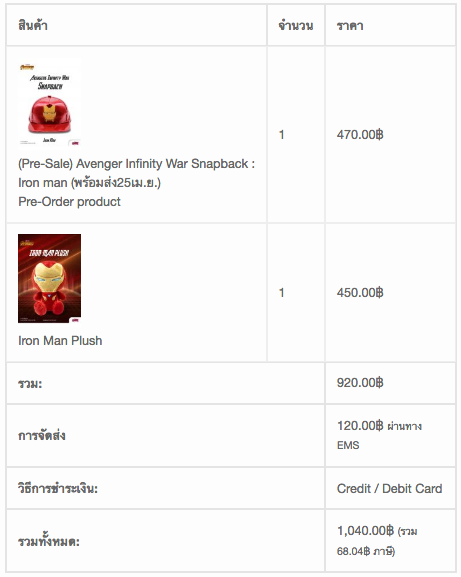 ไม่กี่วันถัดมา เจอตุ๊กตาไอรอนแมนกับหมวกไอรอนแมนก็รีบกดลงตะกร้าทันที พอกดจะจ่ายค่าสินค้า เห็นว่าโดนค่าส่ง 120 บาท เลยคุ้นว่าตอนหนังเรื่อง Black Panther ก็มีตุ๊กตาขายหน้าโรงหนัง จะมาเสียค่าส่งทำไม ก็เลยโทรเข้าไปสอบถามที่เมเจอร์สโตร์ พนักงานแจ้งว่า “ไม่ขายหน้าโรงครับคุณลูกค้า ให้รีบซื้อครับ เดียวของจะหมดก่อนขายแค่ 300 ตัว” ต้องรีบอีกแล้วก็กดไปค่ะ ของจะมาส่งก่อนหนังเข้า ก็สบายใจไปค่ะ