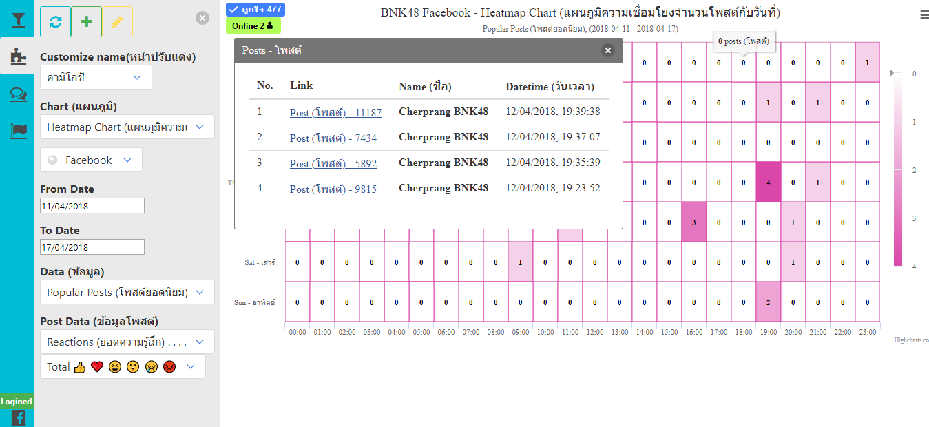 แผนภูมิแผนที่เชื่องโยง(heatmap) จะสามารถใช้ดูข้อมูลการโพสต์ของสมาชิกได้เท่านั้น