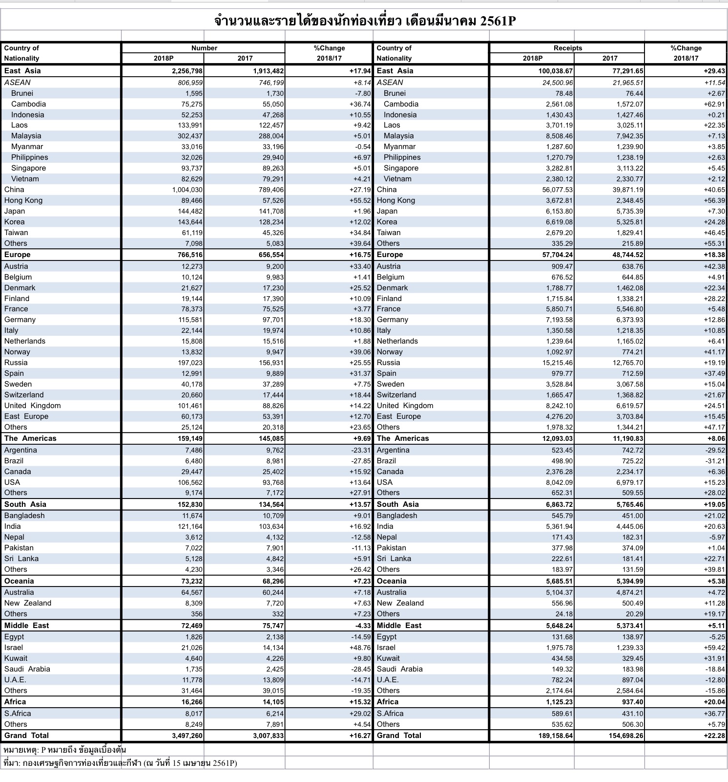 จำนวนนักท่องเที่ยวต่างชาติเดือนมีนาคาเติบโตกว่า 16% เมื่อเที่ยบกับช่วงเวลาเดียวกันของปีก่อน