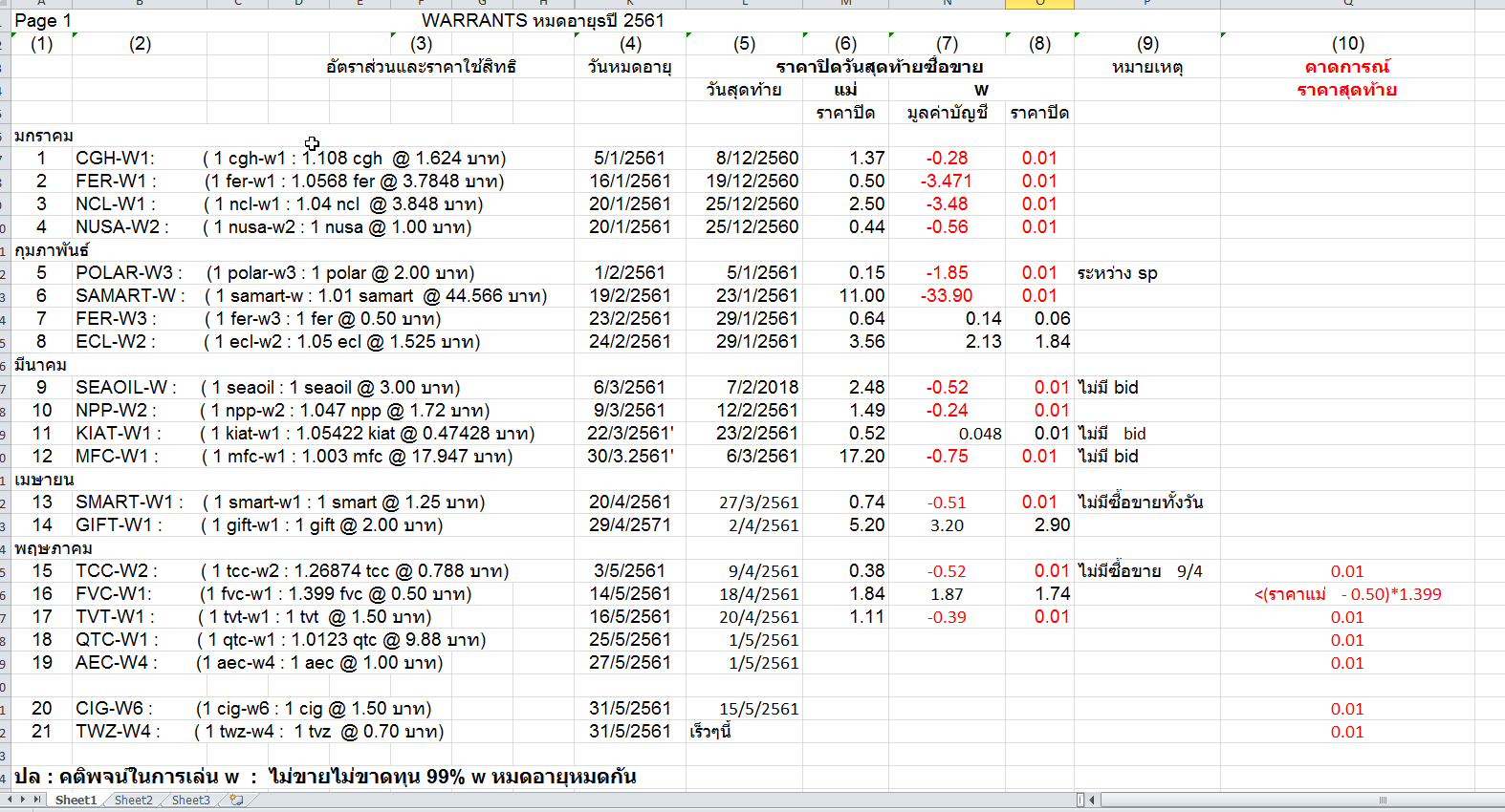 I. Warrants ได้จนบทบาทตัวเอง 1/1/2561 - 3/5/2561 II. Warrants ซื้อขายวันสุดท้าย มิถุนายน ถึง กรกฎาคม 2561 มีทั้งหมด 14 warrants พอแยกออกเป็น 2 หมวด ก. หมวด A. ข