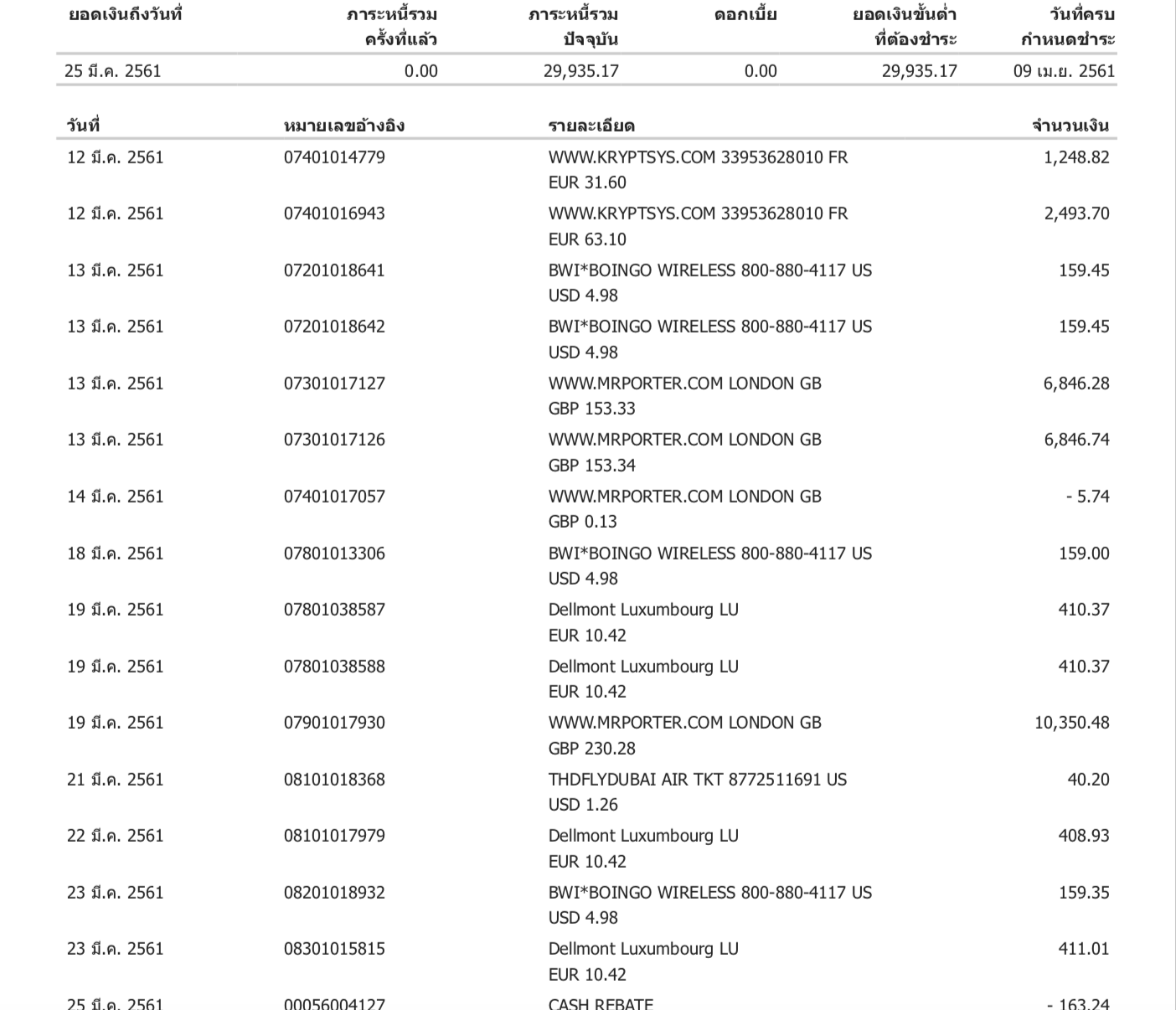 จากรูป เราไม่เคยไปเที่ยวยุโรป หรือ สั่งซื้อของจากเว็บนั้นเลยค่ะ และน่าแปลกใจคือบัตรที่เราคิดว่าปิดไปแล้วกลับกลายเป็นว่ายังไม่ได้ปิด เราเลยถามว่ามีบันทึกหรือข้อมูลเก่าในระบบมั้ยที่ระบุว่าเราติดต่อเข้าไป จนท ตอบว่า ระบบปิดแล้วเพราะเป็นเวลากลางคืนจึงไม่สามารถเช็คได้ (ตอนนั้นเป็นเวลาห้าทุ่มที่ไทย) แล้วบอกจะส่งฟอร์มมาให้ทางอีเมล์ (ฟอร์มอะไรก็ไม่ทราบ จนขณะนี้ก็ยังไม่ได้ค่ะ)