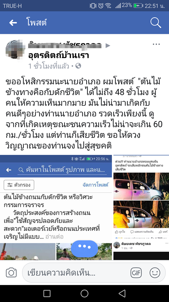 และล่าสุดวันนี้ (21 เมษายน 2561) ได้เกิดอุบัติรถยนต์ชนต้นไม้เป็นเหตุให้นายอำเภอทองแสนขัน จังหวัดอุตรดิตถ์ เสียชีวิต นายตำรวจท่านดังกล่าวก็ได้โพสต์ลงกลุ่มของจังหวัดอุตรดิตถ์อีกครั้ง และเหมือนจะโยงว่าสาเหตุการตายของท่านนายอำเภอ มาจากต้นไม้ โดยที่ยังไม่มีใครทราบเลยว่าสาเหตุที่แท้จริงแล้วเกิดจากอะไร
