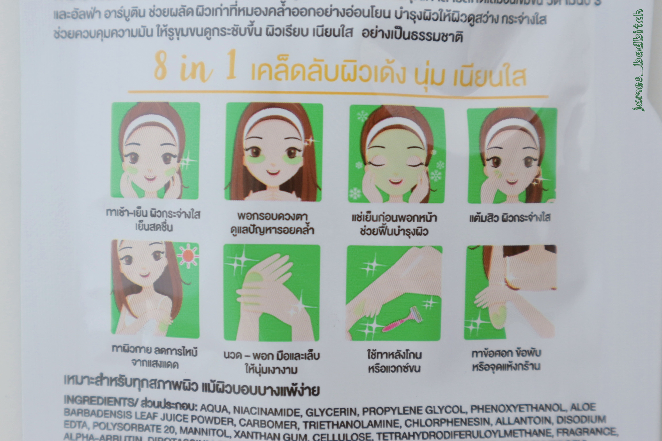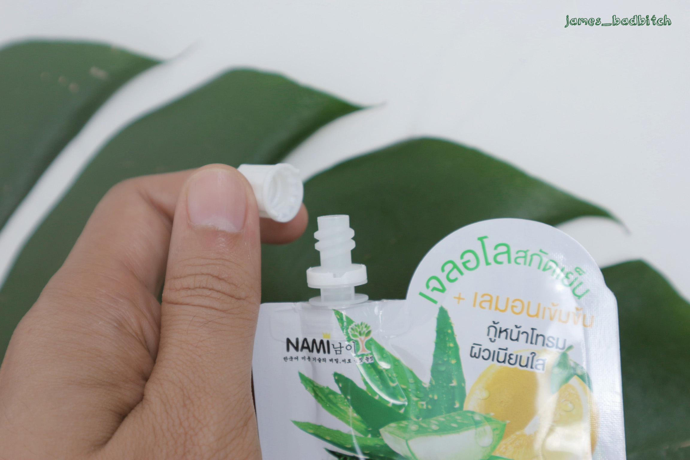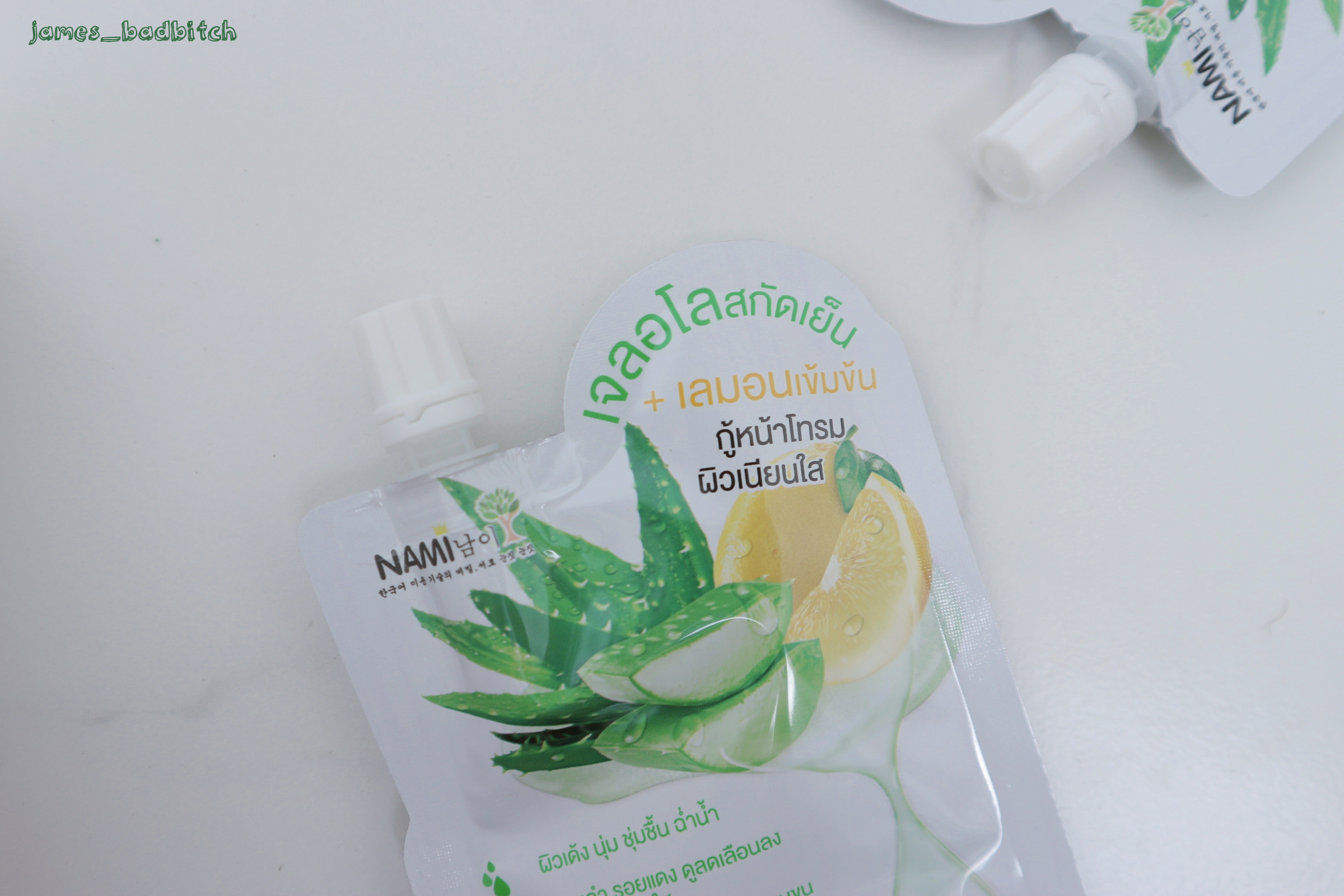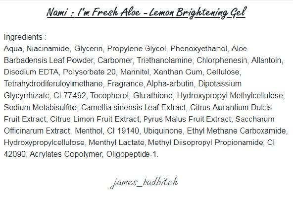 สิ่งที่น่าสนใจอีกหนึ่งอย่างก็คือ เจ้า NAMI I’m Fresh Aloe-Lemon Brightening Gel เขายังใส่สารสกัดจากพืชธรรมชาติต่างๆอีกมากมายที่จะช่วยผิวเราให้กระจ่างใส สมบูรณ์มากขึ้น ได้แก่ Alpha-Arbutin ให้ผิวกระจ่างใส +สารสกัดจากรากชะเอม ที่จะช่วยลดระคายเคืองแถมผิวกระจ่างใสขึ้น กระ ต่างๆดีขึ้น + วิตามิน E ธรรมชาติ ช่วยเสริมการปกป้องผิว ให้ผิวอ่อนเยาว์ + Glutathione ให้ผิวกระจ่างใส + สารสกัดจากใบชาเขียว ต้านอนุมูลอิสระ กระชับรูขุมขน + สารสกัดจากส้มเกลี้ยง / สารสกัดจากเลมอน / สารสกัดจากแอปเปิ้ล / สารสกัดจากอ้อย ช่วยให้ความชุ่มชื่นและช่วยผลัดเซลล์ผิวอ่อนๆ + Q10 +Oligopeptide-1 ซึ่งสารเหล่านี้จะช่วยให้ผิวของเราสุขภาพดีมากขึ้นนั่นเอง และสารเหล่านี้เองที่เจมส์คาดว่าน่าจะเป็นสารใดสารนึงที่อยู่ในเม็ดบีดส์หรือเม็ดแคปซูลที่บรรจุสารบำรุงไว้