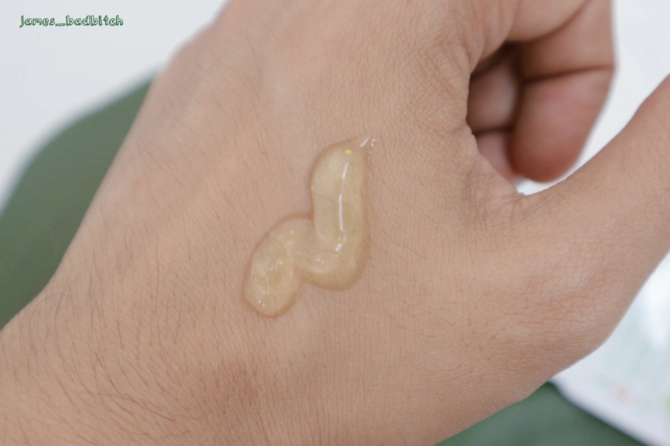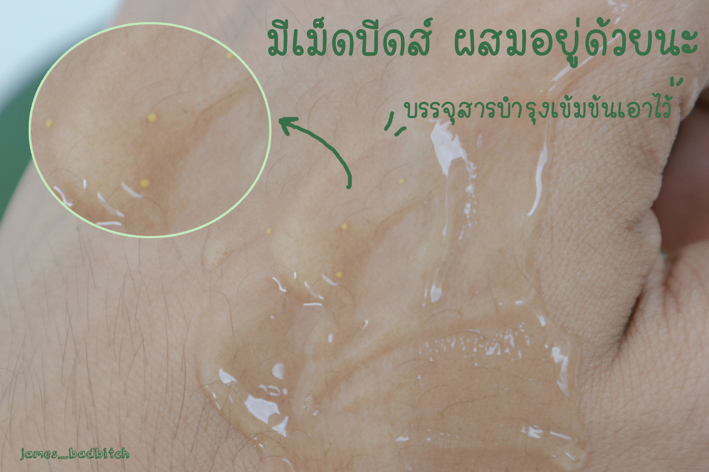 เนื้อผลิตภัณฑ์ : เป็นเนื้อเจลใส แต่มีเม็ดบีดส์ผสมอยู่ด้วย เม็ดบีดส์สีเหลืองๆเกลี่ยแล้วเม็ดบีดส์แตกตัวง่าย ไม่บาดผิว เนื้อเจลมีกลิ่นอ่อนๆ ไม่ฉุดมากนัก