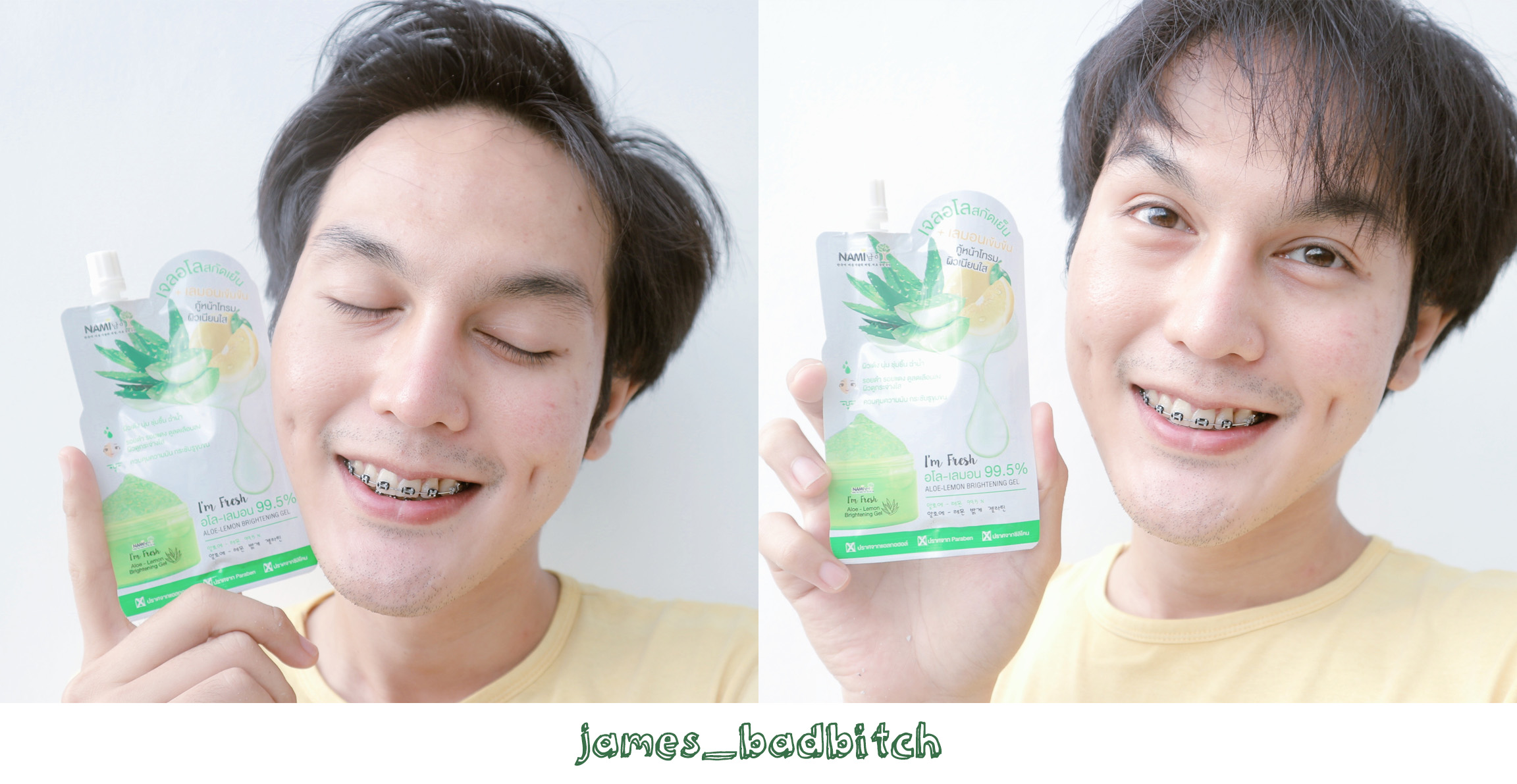 NAMI I’m Fresh Aloe-Lemon Brightening Gel เขายังใส่สารสกัดจากพืชธรรมชาติต่างๆอีกมากมายที่จะช่วยผิวเราให้กระจ่างใส สมบูรณ์มากขึ้น ได้แก่ Alpha-Arbutin ให้ผิวกระจ่างใส +สารสกัดจากรากชะเอม ที่จะช่วยลดระคายเคืองแถมผิวกระจ่างใสขึ้น กระ ต่างๆดีขึ้น + วิตามิน E ธรรมชาติ ช่วยเสริมการปกป้องผิว ให้ผิวอ่อนเยาว์ + Glutathione ให้ผิวกระจ่างใส + สารสกัดจากใบชาเขียว ต้านอนุมูลอิสระ กระชับรูขุมขน + สารสกัดจากส้มเกลี้ยง / สารสกัดจากเลมอน / สารสกัดจากแอปเปิ้ล / สารสกัดจากอ้อย ช่วยให้ความชุ่มชื่นและช่วยผลัดเซลล์ผิวอ่อนๆ + Q10 +Oligopeptide-1 ซึ่งสารเหล่านี้จะช่วยให้ผิวของเราสุขภาพดีมากขึ้นนั่นเอง และสารเหล่านี้เองที่เจมส์คาดว่าน่าจะเป็นสารใดสารนึงที่อยู่ในเม็ดบีดส์หรือเม็ดแคปซูลที่บรรจุสารบำรุงไว้