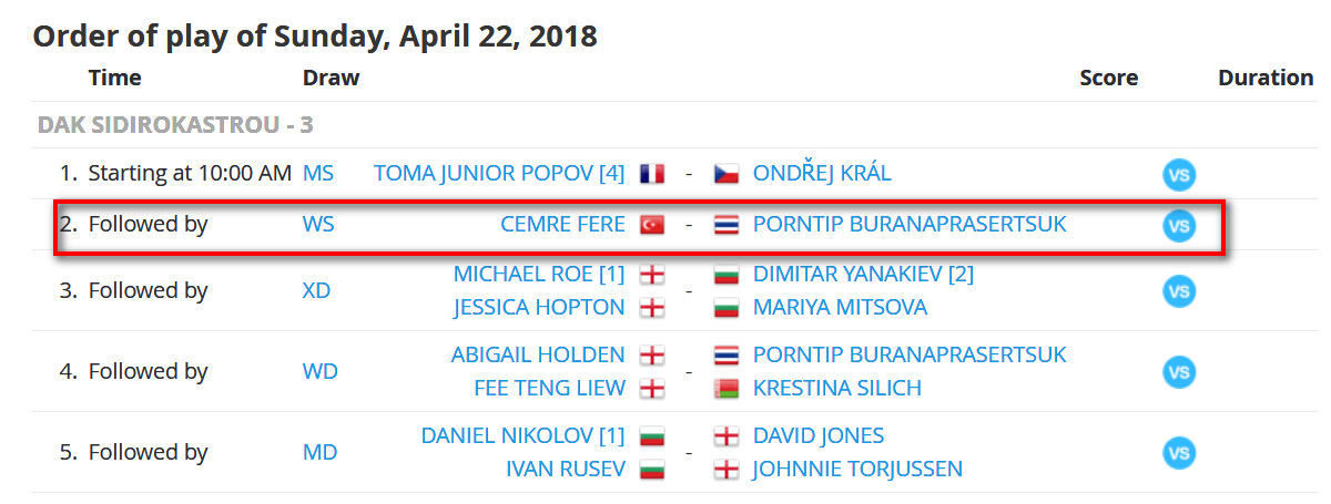 รอบชิงชนะเลิศ ประเภท หญิงเดี่ยว เจมเร่ เฟเร (ตุรกี) 0 - 0 พรทิพย์ บูรณะประเสริฐสุข (ไทย) เซ็ต คะแนน คอร์ดถ่ายทอด คู่ที่ 2 ประเภท หญิงคู่ อะบิเกล + ฝีเต็ง (อังกฤษ) 0 - 0 พรทิพย์ + เครสตีน่า (ไทย +