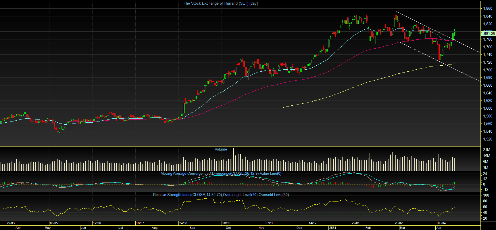 SET index TF Day: ตลอดทั้งสัปดาห์ที่ผ่านมา ดัชนีพุ่งทะยานขึ้นไปได้อย่างต่อเนื่อง จนสามารถทะลุผ่านแนวต้านด้านบน และกลับขึ้นไปยืนเหนือ EMA25, 75 วัน ได้สำเร็จอีกครั้ง ซึ่งเป็นการทำลายสัญญาณ Dead Cross ได้อย่างสิ้นเชิง พร้อมกับเป็นการยืนยัน “Bullish Flag” ซึ่งแนวโน้มถัดจากนี้ คาดว่ามีโอกาสที่จะเห็นดัชนี กลับขึ้นไปทดสอบจุดสูงสุดเดิมที่เคยทำไว้ ณ ระดับ 1852 จุด ได้อีกครั้ง