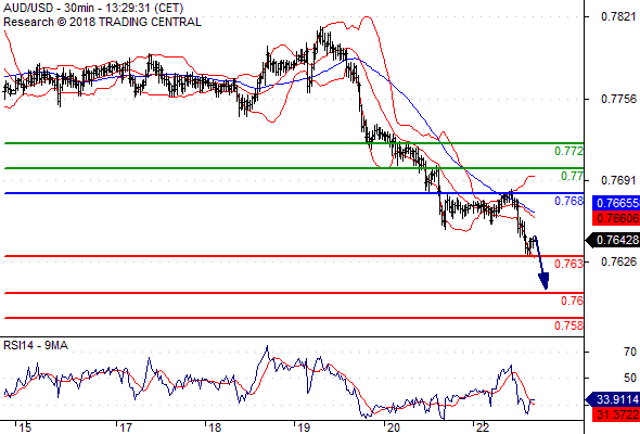 จุดที่ต้องการ: สถานะขายต่ำกว่า 0.7680 เป้าหมายต่อไปที่ 0.7630 และ 0.7600