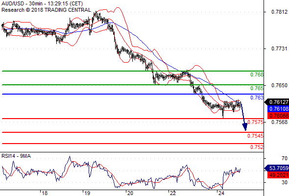จุดที่ต้องการ: สถานะขายต่ำกว่า 0.7630 เป้าหมายต่อไปที่ 0.7575 และ 0.7545