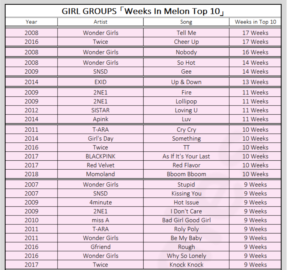 girl group k-pop วงไหนที่มีสถิติเพลงติดชาร์ตนานที่สุด