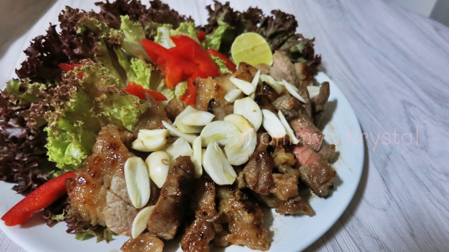 ไปเดินแมคโครมาได้เสือร้องไห้แพคละ 80 มา เอามาทำง่ายๆ หมัก ซอาฝาเขียวกับน้ำตาล ทิ้งไว้ครึ่งชั่วโมง ย่างกับกะทะเทฟล่อนจนสุก