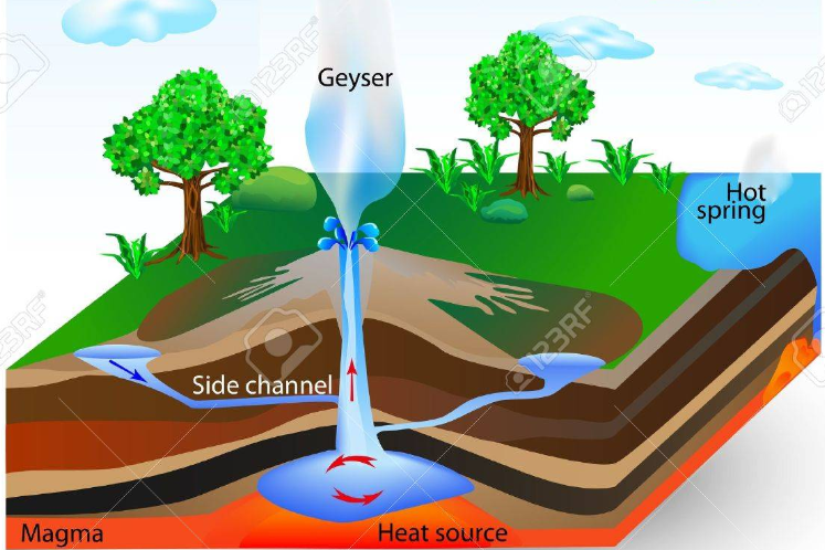 ตามภาพนี้ พวกบ่อน้ำร้อน (Hot spring) และ น้ำพุร้อน (Geyser) ก็ได้ความร้อนมาจาก magma