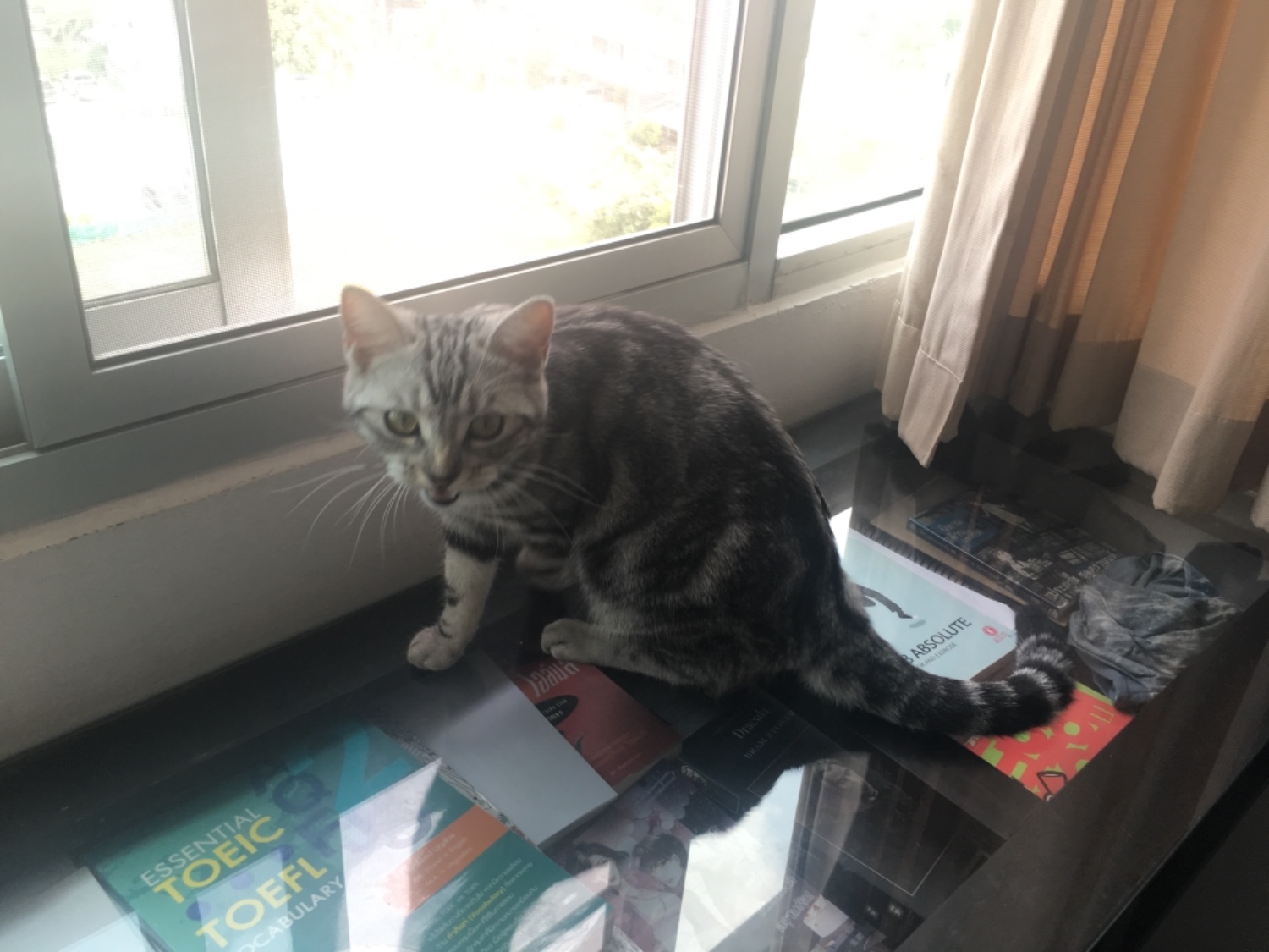 ปกติเราชอบอ่านหนังสือมุมนี้ที่สุด แต่มันกลายเป็นจุดชมวิว+นอนกลางวันของน้องไปแล้ว