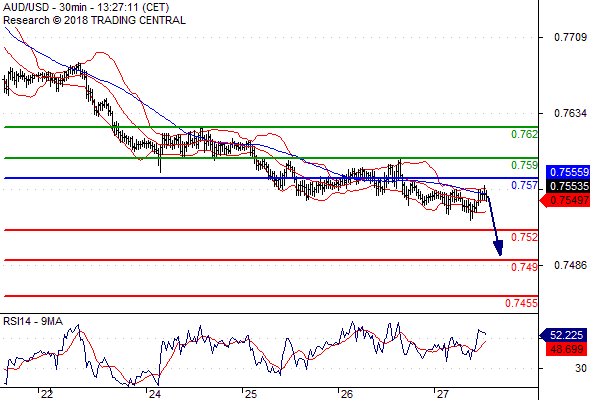 จุดที่ต้องการ: สถานะขายต่ำกว่า 0.7570 เป้าหมายต่อไปที่ 0.7520 และ 0.7490