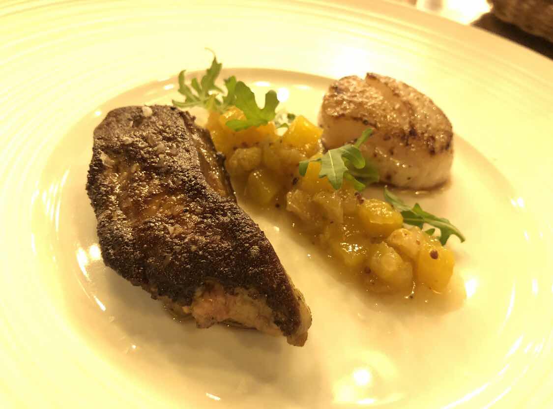 จานนี้เป็นฟัวกราส์ กับ scallop ตัวยักษ์ ตรงกลางเป็นซอสมะม่วงแบบมีมะม่วง