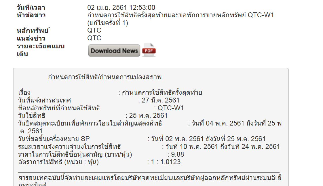 ระหว่าง 10/5 - 24/5/2561 มีสิทธิที่จะทำกำไรเมื่อหุ้นแปลง qtc เข้ามาซื้อขายประมาณปลาย มิถุนายน 2561 ลุ้นราคาแม่ในกระดานจะสูงกว่า 9.88 ค่าแปลง ส่วนต่างได้ทุน qtc-w1 คืนมาบ้าง ขอให้โชคดี