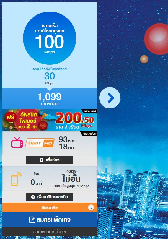 ผมสนใจความเร็วตามภาพ แต่ปัจจุบันผมใช้ไฟเบอร์อยู่แล้ว ความเร็ว 30Mb อัพโหลด 10Mb และได้รับชมทรูวิชั่นแพคเอนจอยอยู่แล้ว
