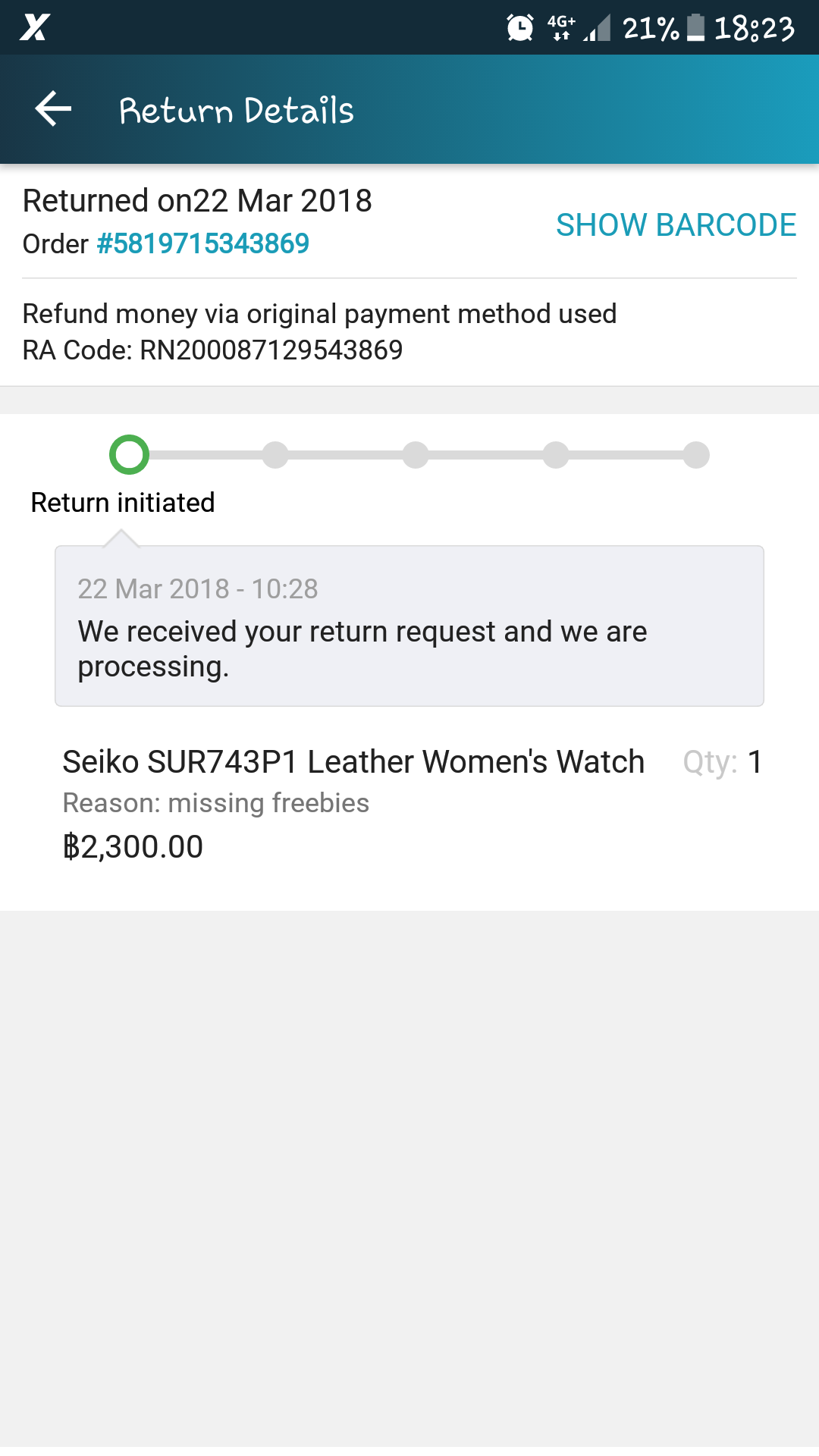 เราก็รอ จนสักพักมีการเคลื่อนไหว แจ้งว่า ร้านค้าส่งมาจากต่างประเทศแล้วเมื่อต้นเดือนมกราคม (แต่เราสั่งปลายกุมภา ????) เราเลยโทรไปถามลาซาด้าอีกรอบว่าตกลงมันยังไง สรุปลาซาด้าเลยทำการยกเลิกสินค้าให้เราเองเมื่อ 22/3/61