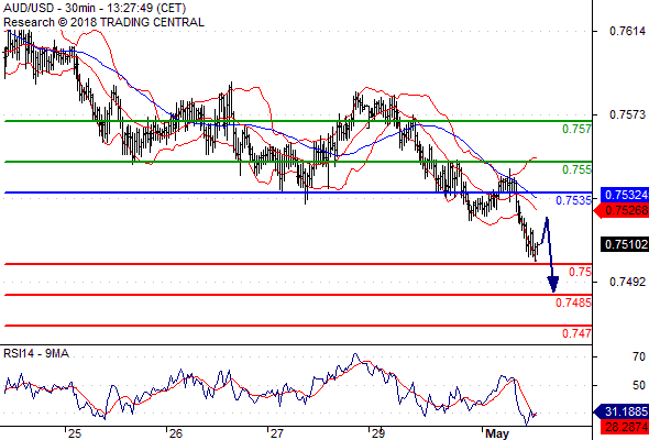 จุดที่ต้องการ: สถานะขายต่ำกว่า 0.7535 เป้าหมายต่อไปที่ 0.7500 และ 0.7485