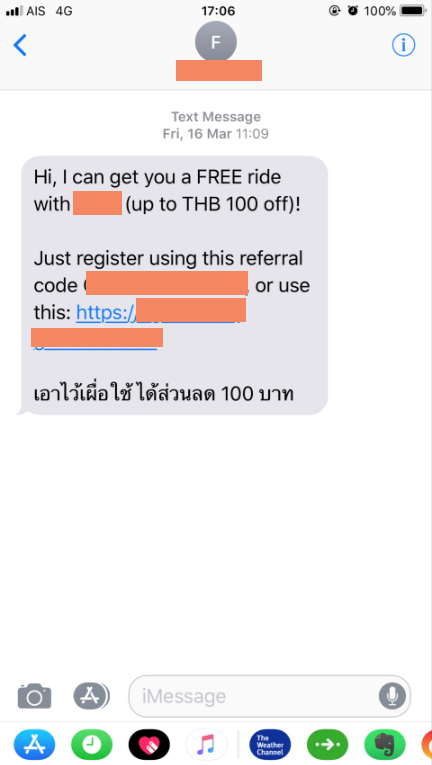 พอดีว่าอยากจะมาแชร์ประสบการณ์ใช้ App เรียกรถเจ้าดัง ที่มี Feature แนะนำเพื่อนให้ใช้บริการ โดยการให้ส่งโค้ดแชร์ไปที่เพื่อน โดยบริการ Fast track to free Rides ของ Apps ให้ทำการกด invite friends มาจาก contact list ในมือถือของเรา จากนั้นให้เลือกรายชื่อเพื่อนที่ต้องการส่ง Code ไปให้ แล้วกด ส่ง โดยที่ระบบไม่ได้ทำการเตือนให้ผู้ใช้งานทราบแม้แต่น้อยว่านั้นคือ การส่ง SMS ไปให้เพื่อนของเรา รวมทั้งไม่ได้ระบุว่าเป็นการเสียค่าบริการ SMS ที่ทางผู้ใช้งานต้องจ่ายค่าบริการเองแม้แต่น้อย กว่าจะรู้ภายหลังก็ได้บิลเรียกเก็บค่าบริการจากค่ายมือถือของเรา