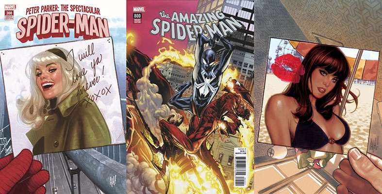 ภาพหนึ่งภาพสื่อความหมายได้ล้านคำ ถ้าภาพสามภาพ...มโนได้เป็นวรรคเป็นเวรครับ สรุปคือผู้วาดปก Variant ของ Peter Parker: The Spectacular Spider-Man #300 ที่มีรูปเกวนสเตซี่อยู่นั้นได้วาดปก Variant ของ The Amazing Spider-Man #800 ด้วยคอนเซ็ปต์คล้ายกันแต่เป็นรูปแมรี่เจน ส่วนภาพปก Variant ที่เคยเซ็นเซอร์ชุดสไปดี้ตอนนี้ก็เผยเต็ม ๆ แล้ว ยังไม่ชัวร์ว่าชุดดำนี้เป็นซิมไบโอตรึเปล่า ต้องรอลุ้นกันปลายเดือนนี้เลยครับ