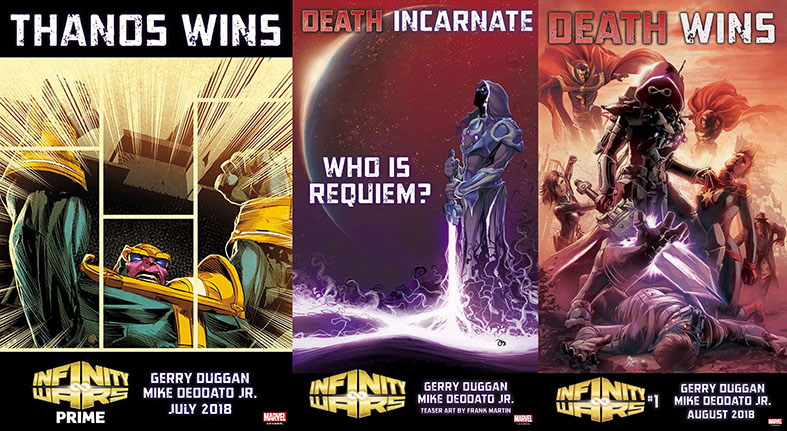 ข่าวเพิ่มเติมเกี่ยวกับอีเวนต์ Infinity Wars มีภาพโปรโมท Infinity Wars Prime ที่จะวางขายเดือนกรกฎาคม ราวกับจะสปอยล์หนังว่า...Thanos Wins!! ตามมาติด ๆ ด้วยภาพปก Infinity Wars #1 เดือนสิงหาคม ซึ่งตัวละครปริศนากำลังจะเชือดเหล่าผู้ครอบครองอินฟินิตี้สโตนทั้ง 6 ...ล่ะมั้งนะ นี่หมายความว่าสเตรนจ์แย่งไทม์สโตนมาจากซูเปอร์สครัลล์ และอดัมวอร์ล็อคแย่งโซลสโตนจากอัลทรอนมาได้ ที่ไม่น่าเชื่อคือ...ไอ้คุณเติร์กผู้ครอบครองไมนด์สโตนยังจะรักษามันไว้ได้อีกเรอะ (ก่อนหน้านี้ผมจำผิดคนไปหน่อย หมอนี่ไม่ได้ตายในทีวีซีรีย์ Luke Cage แถมยังมาโผล่ใน Jessica Jones season 2 ด้วย ใช่มะ) ท่าทางเขาหรือเธอผู้เป็นปริศนาคนนี้จะมีสมญานามว่าเรเควียม เป็นใครและเกี่ยวข้องอะไรกับแม่นางเดธรึเปล่า คงต้องติดตามกันต่อไป