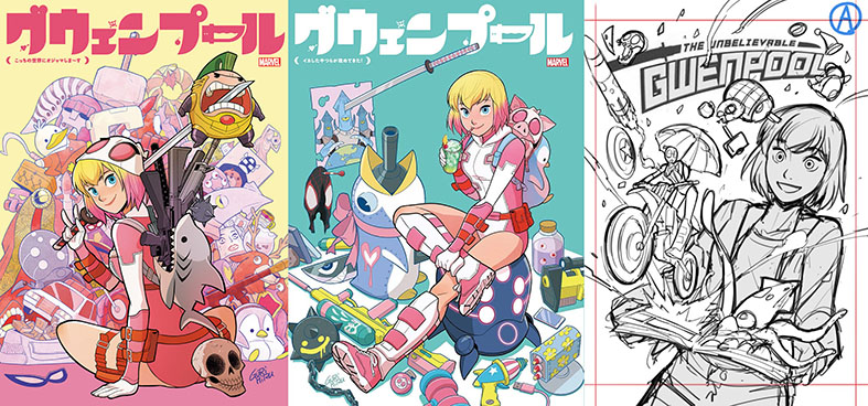 Gwenpool ฉบับภาษาญี่ปุ่นได้ฤกษ์คลอด Vol. 2 แล้ว หน้าปกยังคงหวานแหววสไตล์ Gurihiru และคงคอนเซ็ปต์เดิมคือเกวนพูเล่กับเหล่าไอเท็มที่ปรากฏในเล่มนั้น ๆ โดย Vol. 1 ครอบคลุมบทปราบโมด็อค Vol. 2 ครอบคลุมเนื้อเรื่องทะเลาะกับไมล์สและปราบวินเซนต์กับพวกเอเลี่ยนหมึกกล้วย ส่วนภาพร่างทางขวานั่น...ไม่รู้สิ ภาพเวอร์ชั่นแรกของ Vol. 1 มั้ง เห็นเก๋ดีเลยเอามาแปะด้วย