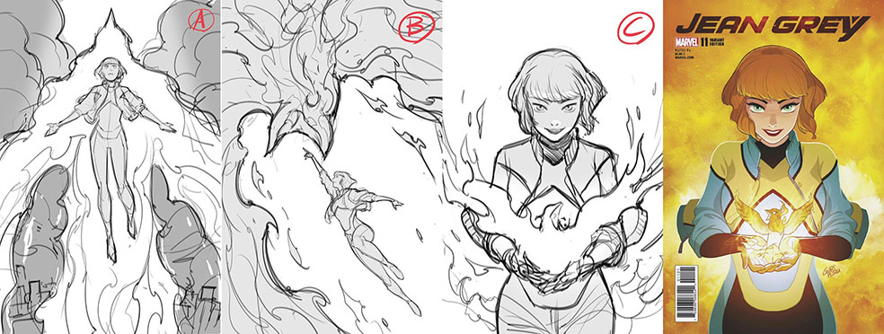 และนี่คือเบื้องหลังของภาพปก Variant ของ Jean Grey #11 (ฟีนิกซ์ค่อย ๆ สาละวันเตี้ยลง)