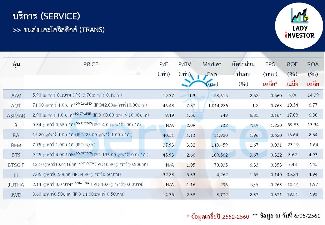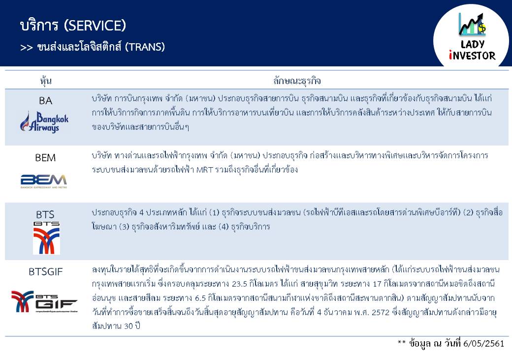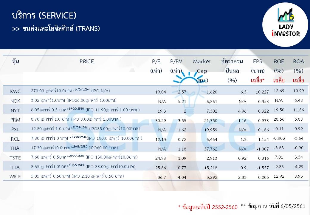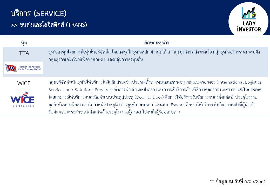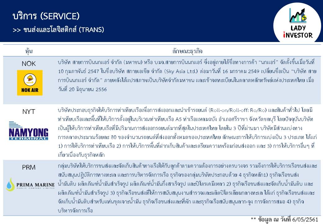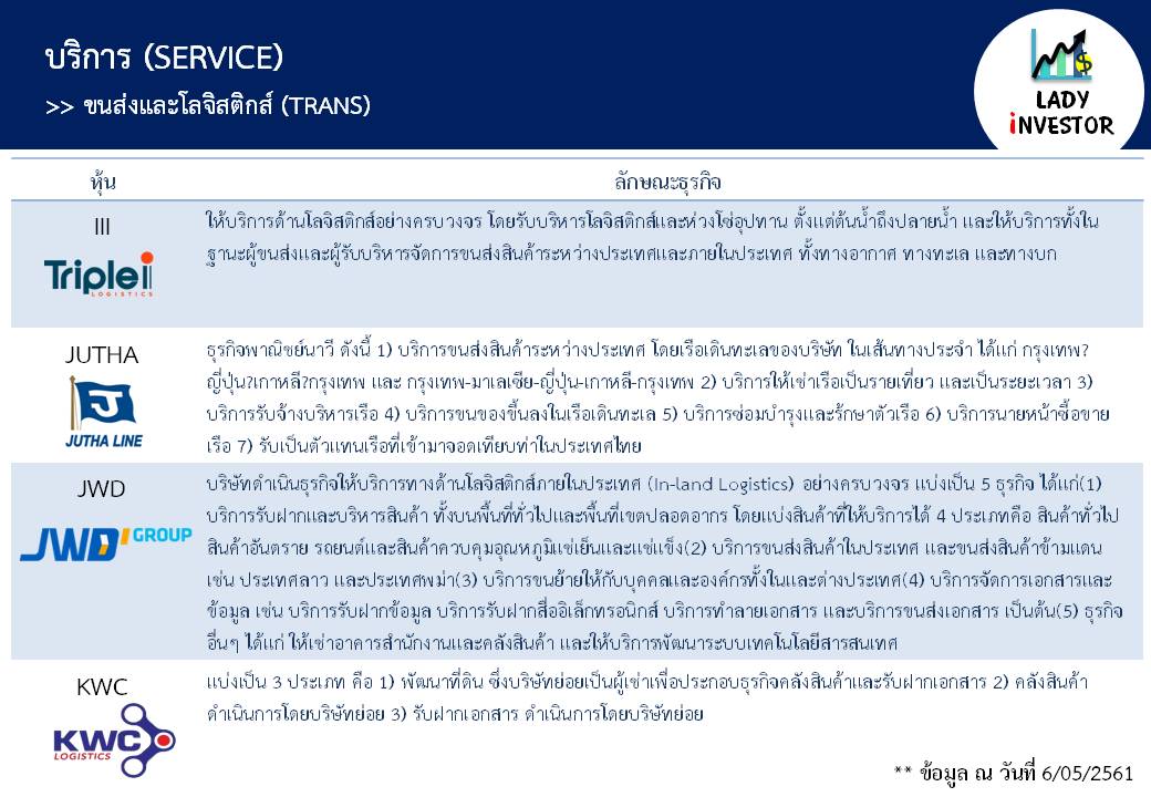 **หมายเหตุ ข้อมูลข้างต้นนี้ LI ทำเพื่อให้ทุกท่าน รู้จักหุ้นในกลุ่มขนส่งและโลจิสติกส์ TRANS ทุกตัวให้มากขึ้นไม่ได้มีเจตนาแนะนำหุ้นแต่อย่างใดนะเจ้าคะ ถ้าชอบใจฝากติดตามผลงานด้วยนะคะ กดถูกใจเพจ และแชร์ ก็ถือเป็นกำลังใจให้แล้วค่ะ