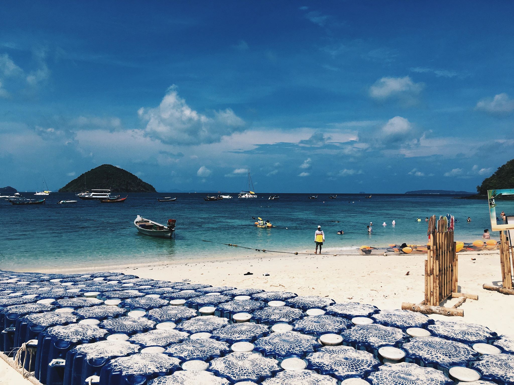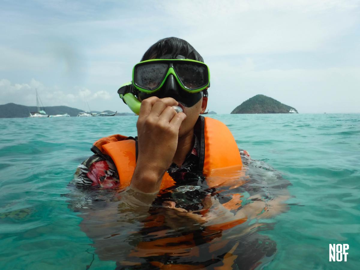 เราควักเงินออกมาคนละ100จ่ายไป พร้อมเอาสัมภาระวางจองที่ไว้ทันที หลังจากจัดแจงตัวเองเราเรียบเราก็จะเริ่มทำกิจกรรมหลักของเราในวันนี้คือ “การดำน้ำ”นั่นเอง เราทั้ง4หยิบแว่นและชูชีพมาสวมใส่ไว้ประจำกายและค่อยเดินลงทะเลไปอย่างช้าๆ ผ่านนักท่องเที่ยวมากมายซึ่งส่วนใหญ่แล้วนั้นล้วนเป็นชาวต่างชาติทั้งสิ้น และอีกอย่างที่เราสังเกตเห็นได้ชัดเจนเลยคือนักท่องเที่ยวบนหาดนั้นแบ่งโซนของตัวเองชัดมาก คือพวกที่เป็นชาวเอเชียก็จะรวมๆกันอยู่โซนนึง พวกฝรั่งหรือยุโรปก็จะรวมๆกันอยู่อีกโซนนึง เหมือนมันกำลังจะบอกอะไรบางอย่างได้เหมือนกัน…